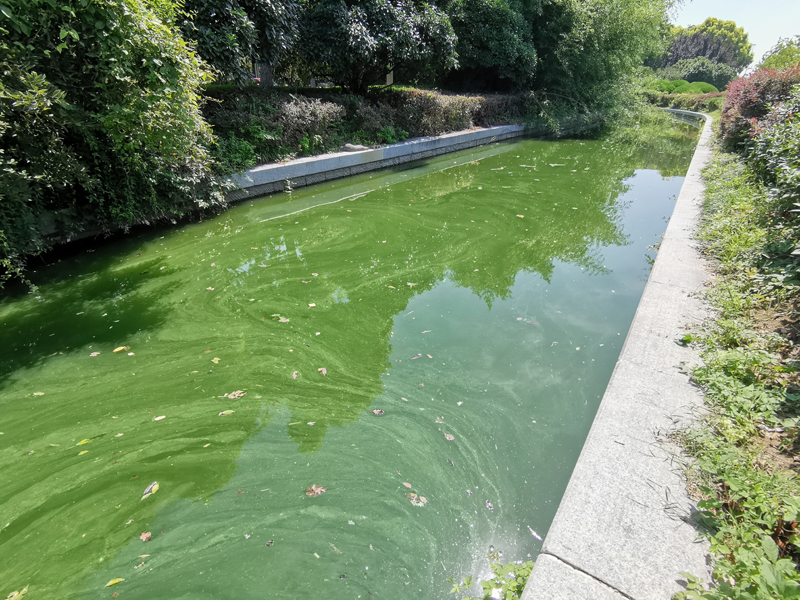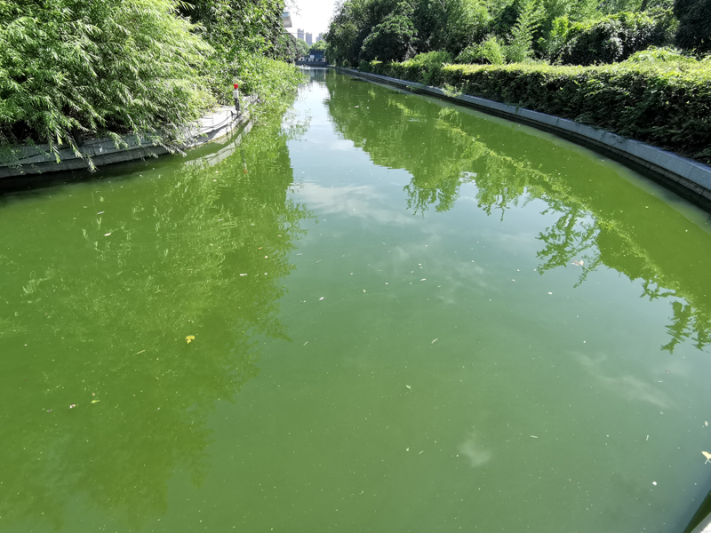 治理前:藍藻爆發(fā),水體發(fā)綠渾濁,水體透明度很低,水質(zhì)為劣五類